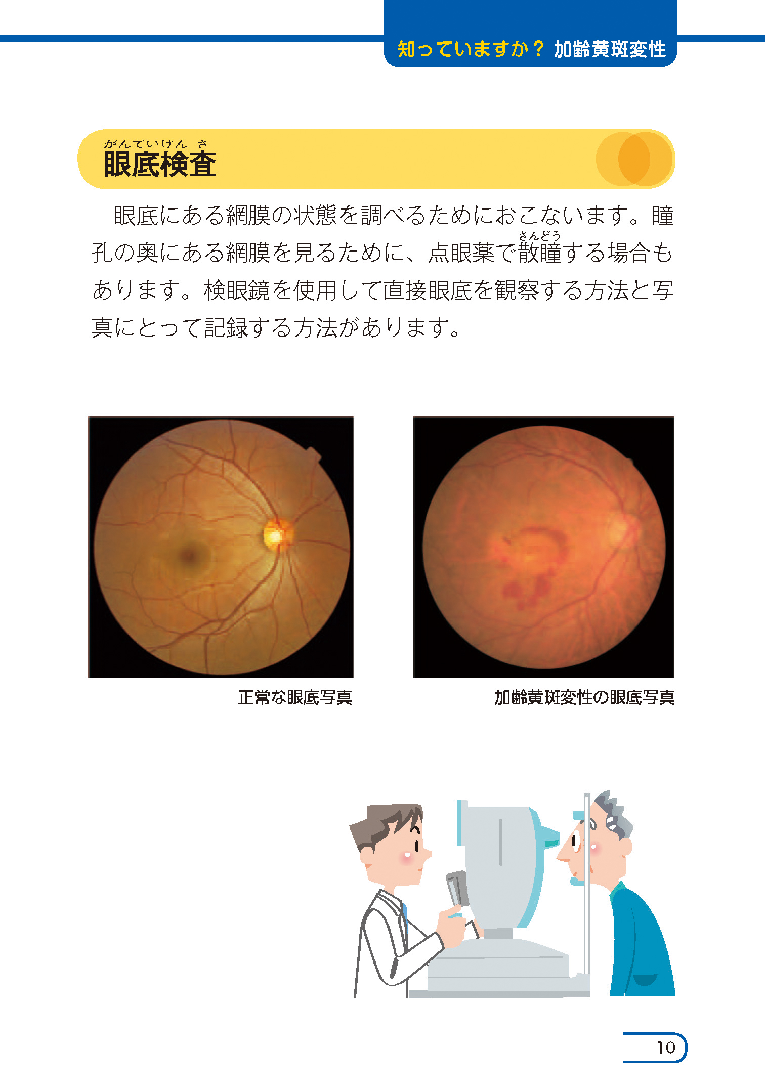 眼の疾患で、「白内障」については ご存知の方が多いと思います。 実は、もう1つ眼の疾患で 注意が必要なのが 「加齢黄斑部変性」です。 3つの動画をご覧ください。 アメリカの非営利団体 The Angiogenesis Foundation 大原千佳先生・平松類先生 NHK健康チャンネルの 【男性の中年以降に多く発症する目の病気 「加齢黄斑変性」とは】 も是非ご覧ください。 また、ご自身でチェックできる アムスラーチャートの用紙は こちらのPDFを印刷してください。 30cmほど離してシートを持ち、 必ず片方の目を隠して、 真ん中にある中心点を見ます。 めがねやコンタクトレンズをしている 場合は装着したまま行います。 「線がゆがんで見えていないか」 「中心点ははっきり見えているか」 「欠けている部分はないか」 を片方ずつチェックします。 1つでも当てはまる症状があると、 加齢黄斑変性など 黄斑の病気の可能性があります。 黄斑とは、網膜の中心部にあり、 最も良い視力が得られる部分です。 黄斑に障害が起きると、 それ以外の網膜に異常がなくても、 視力が著しく低下します。 (NHK健康チャンネルから引用) シートがない場合は、 障子の桟や風呂場のタイルなど 格子状のものを片方ずつ 見ることでもチェックできます。 セルフチェックをして、 異常を感じた場合は、 早めに眼科を受診しましょう。 こちらの表の中心部分に ゆがみがある方は、 こちらのような見え方に、 なる場合があります。 定期的なチェックを行いましょう。 (日本眼科学会から図を引用) 参天製薬のHPにて 「加齢黄斑変性」の解説より